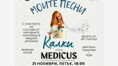 Коцето Калки и група “Медикус” ще пеят благотворително за специалните деца на Дупница. К онцертът е организиран от Общината в подкрепа на кампанията “Бъдеще с усмивка”. Той ще се проведе в Деня на християнското семейство 21 ноември, от 18ч., в салона на Драматичен театър “Невена Коканова”. Ще бъде поставена кутия за дарения, чрез която публиката..