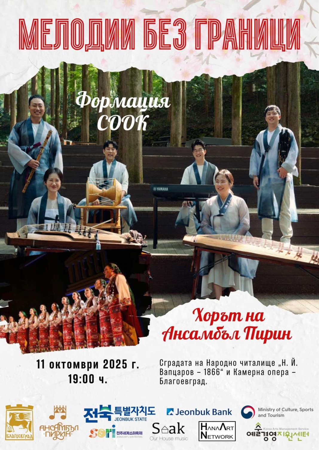 На 11 октомври 2025 г. от 19:00 ч. Благоевград ще бъде домакин на концерта „Мелодии без граници“, който ще събере на една сцена Хора на Ансамбъл „Пирин“ и корейската кросоувър формация СООК (SOOK).
