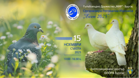 Сдружение „Гълъбовъдно дружество Мир“ – Бургас организира регионалната изложба на гълъби „Есен – Бургас“. Събитието ще се проведе на 15 ноември от 10:00 до 17:00 ч. в зала 2 на Експоцентър „Флора“. Посетителите ще могат да видят най-добрите екземпляри на български и декоративни породи. Изложбата има и оценителен характер – птиците ще бъдат оценявани..