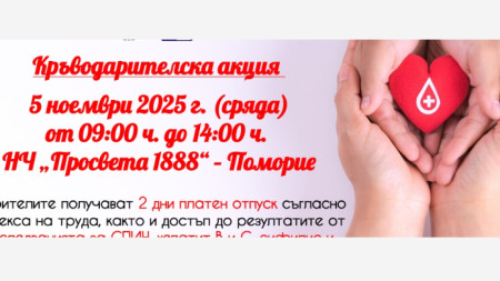 В Поморие днес предстои кръводарителска акция. Тя се организира от Отделението по трансфузионна хематология на УМБАЛ Бургас, съвместно с Община Поморие. Всеки, който желае може да се включи, за да помогне на човек в нужда. Кампанията ще започне в 9 часа в читалище „Просвета 1888“ и ще продължи до 14 часа. Организаторите напомнят, че..