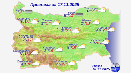 В първия ден от новата седмица над страната ще има значителна висока облачност. В Дунавската равнина на много места през целия ден ще остане предимно мъгливо и почти тихо. До обяд мъглите в южната половина от страната ще се задържат. Около и след обяд ще започне да духа вятър от юг-югозапад, който на север от планините и в източните райони ще бъде и..