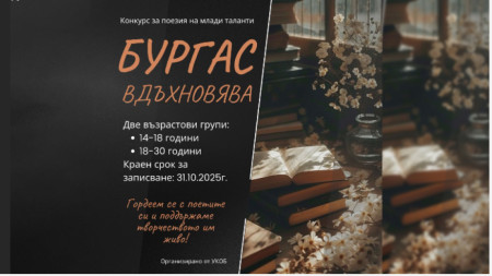 Ученическият комитет на Община Бургас организира първото издание на младежкия поетичен конкурс „Бургас вдъхновява“. Инициативата насърчава младите хора да изразят своята творческа енергия и емоционална връзка с града чрез поезия. Участниците трябва да създадат стихотворение, вдъхновено от цитат на бургаски поет. Цитатът се посочва само в..