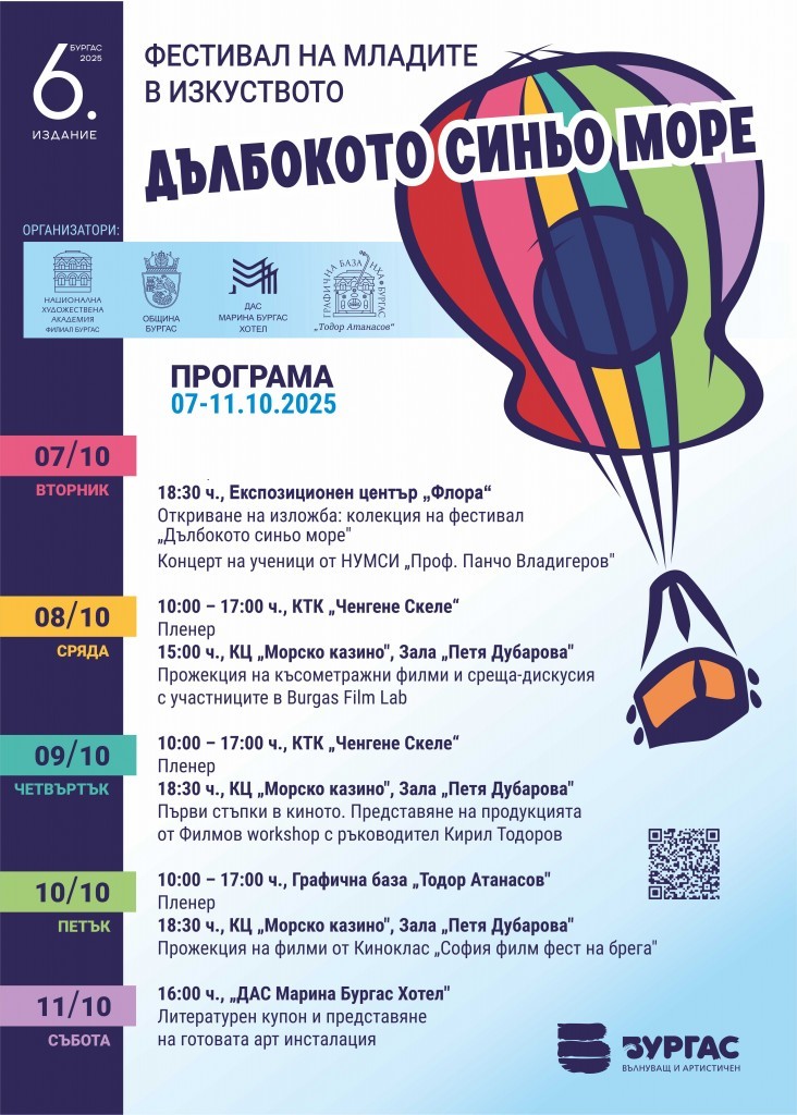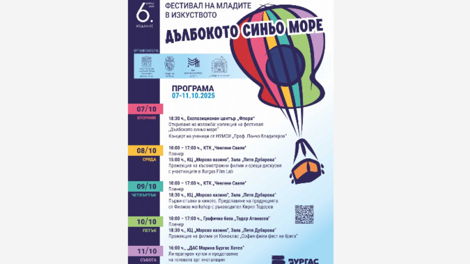 От 7 до 11 октомври в Бургас ще се проведе шестото издание на Фестивала на младите в изкуството „Дълбокото синьо море“. Събитието се организира от Националната художествена академия и Община Бургас и е по идея на проф. Светозар Бенчев, директор на НХА – Филиал Бургас.