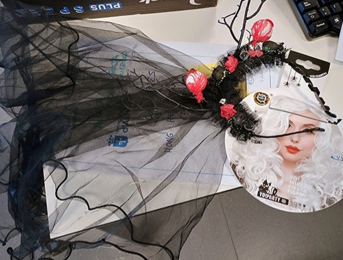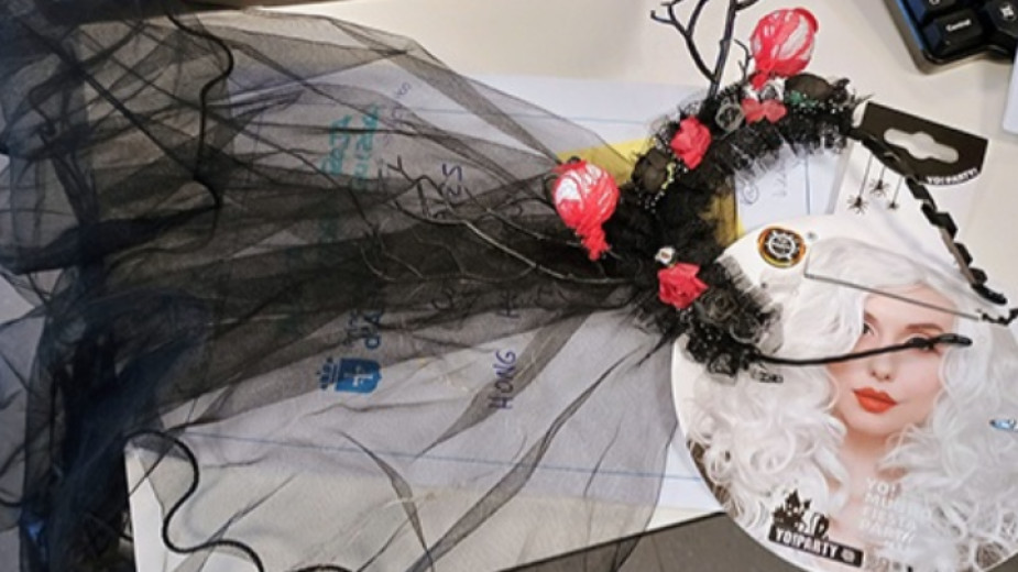 Хелоуинска диадема с бранд Yo! Party и баркод 8445347816723 – с химически риск и опасност от задавяне заради лесно достъпното отделение за батерия.
