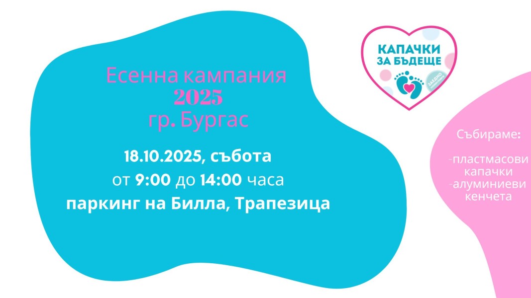 Това е поредната есенна акция на „Капачки за бъдеще“, която се провежда през октомври в различни градове в цялата страна. В Бургас събирането ще е на паркинга на Трапезица от 9 до 14 часа, в събота, 18 октомври. Акции в този ден ще има в още 9 града в страната.