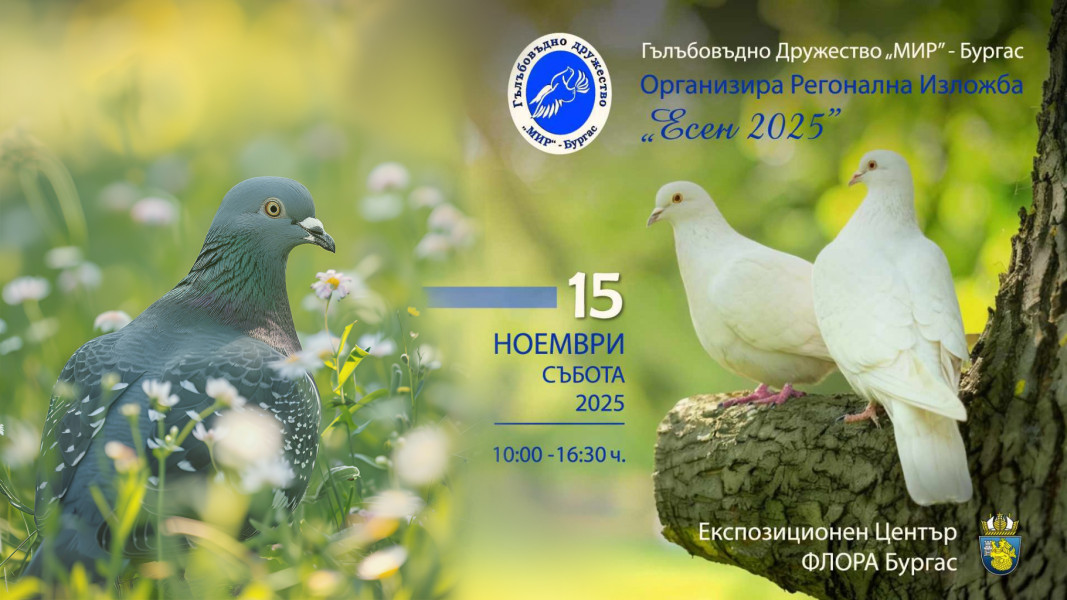 Сдружение „Гълъбовъдно дружество Мир“ – Бургас организира регионалната изложба на гълъби „Есен – Бургас“. Събитието ще се проведе на 15 ноември от 10:00 до 17:00 ч. в зала 2 на Експоцентър „Флора“.