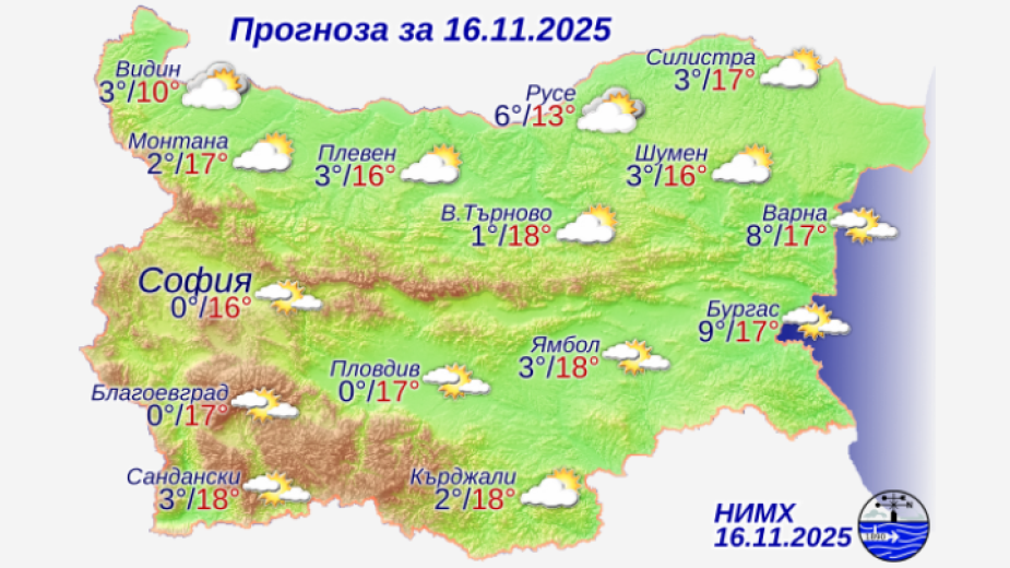 По Черноморието ще е предимно слънчево, в сутрешните часове на отделни места видимостта ще е намалена. Ще духа слаб до умерен вятър от югозапад.
