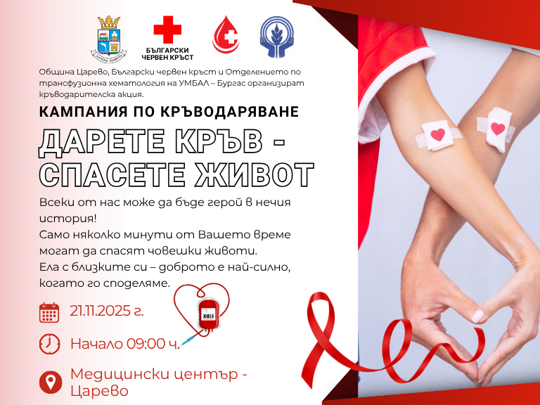 Изнесени акции на отделението до края на годината ще има също в: Медицинския център в Царево на 21 ноември 2025 г., петък, от 9 до 14 ч, както и в Руен на 3 декември в Ритуалната зала от 9 до 14 часа.