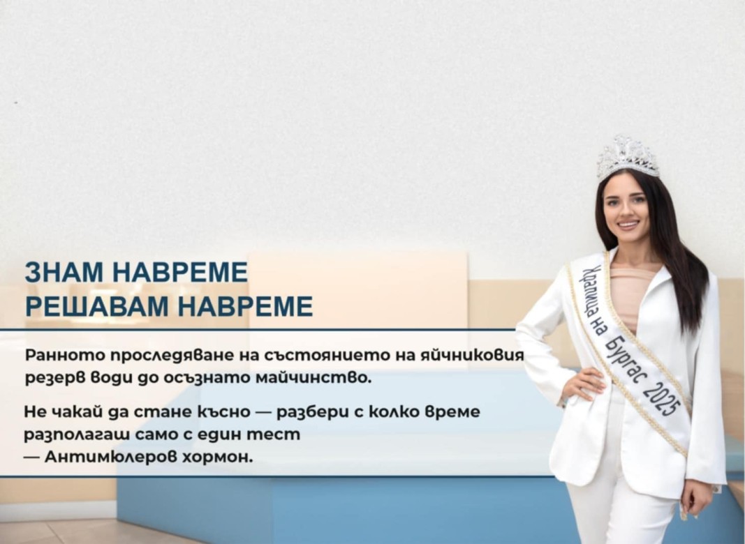 Кампания за ранно изследване на яйчниковия резерв и осъзнато майчинство подема „Кралица на Бургас 2025“ Теодора Димова. Инициативата „Знам навреме. Решавам навреме“ се реализира в партньорство между носителката на короната „Кралица на Бургас“ и организаторката на конкурса Ваня Маринова. Инициативата е насочена към момичета и жени на възраст между 18 и 30 години и има за цел да насърчи ранната профилактика и осъзнатото отношение към факторите, които влияят върху фертилността и бъдещото майчинство.