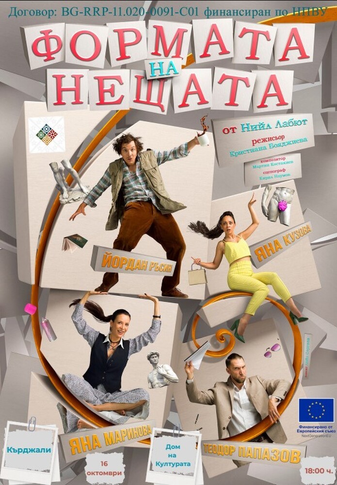 „Формата на нещата“ ще се играе в Бургас на 26 ноември в Драматичен театър „Адриана Будевска“ от 19,00 ч. Представлението е романтична и провокативна комедия, която има за цел да накара публиката да се замисли за важните въпроси-  кой съм аз, харесвам ли се такъв, какъвто съм, имам ли нужда от одобрението на обществото, за да бъда щастлив...