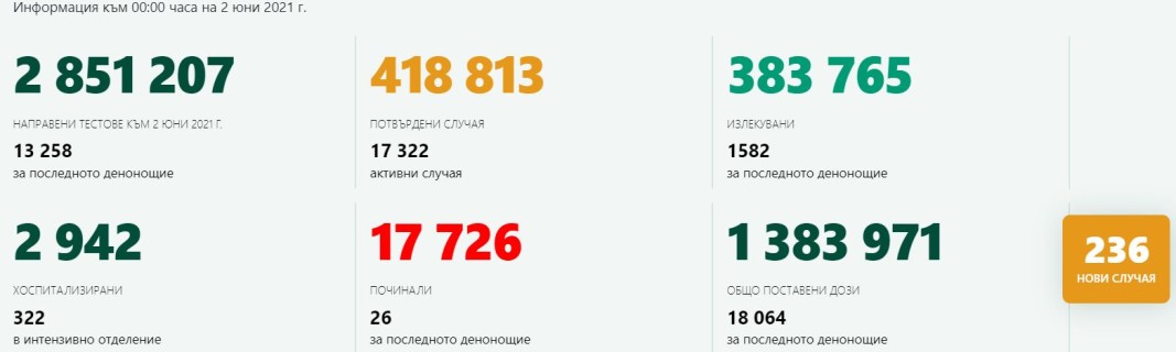 236 са новите случаи на коронавирус у нас за последното денонощие. Положителни са 1,7 на сто от направените над 13 хиляди теста.