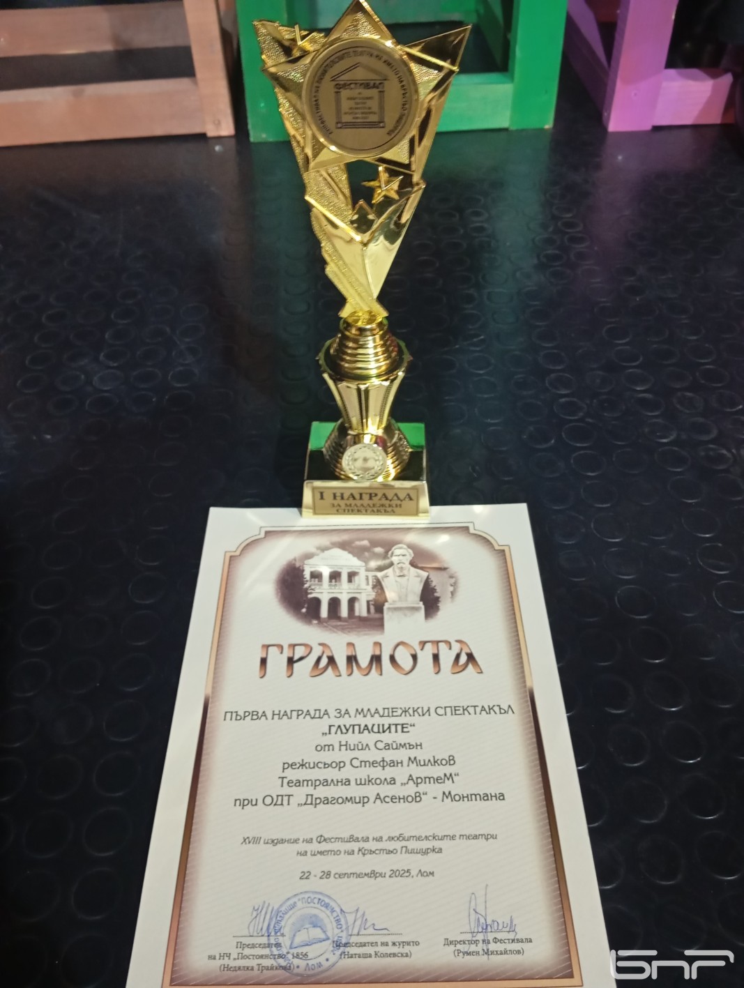 Театрална школа "АртеМ" при Драматичен театър "Драгомир Асенов" в Монтана спечели първа награда за младежки спектакъл на фестивала на любителските театри на името на Кръстьо Пишурка в Лом.