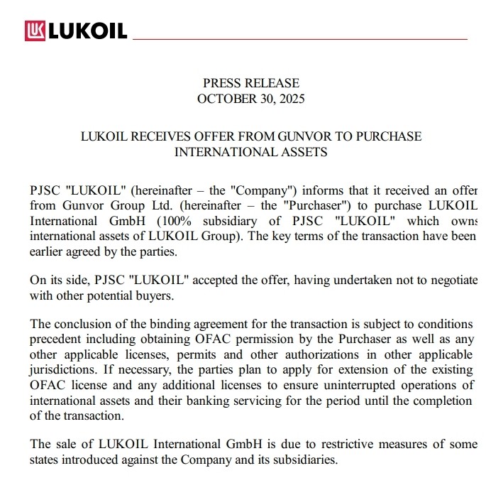 Новината за намерението на "Лукойл" да продаде международните си активи идва дни, след като САЩ и Великобритания санкционираха компанията и дъщерните ѝ дружества.