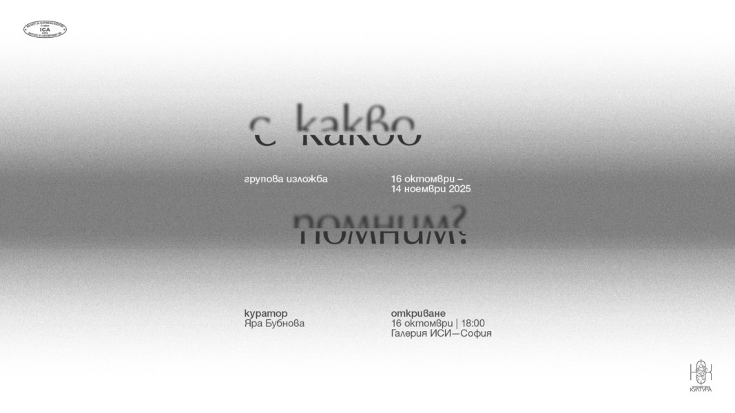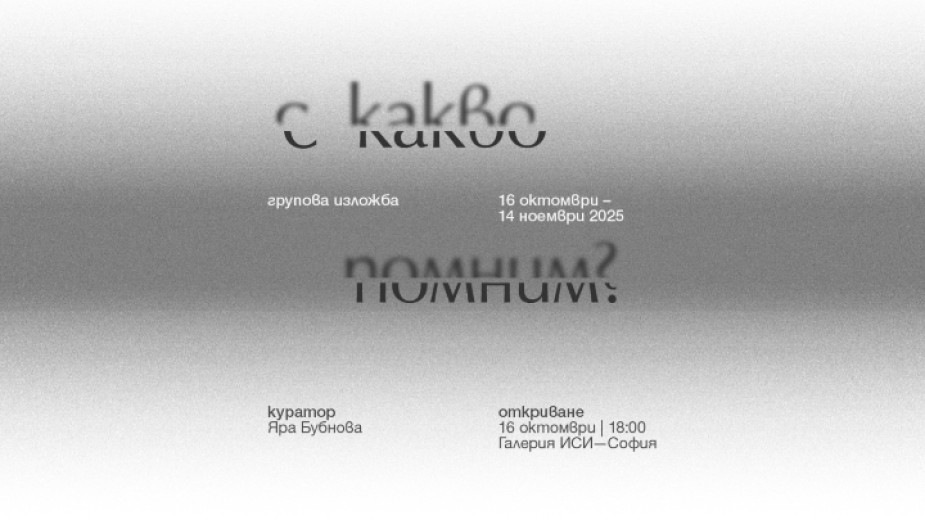 Галерия ИСИ – София към Института за съвременно изкуство представя днес от 18:00 ч. груповата изложба "С какво помним?". Нейн куратор е Яра Бубнова – директор на Националната галерия в периода 2019–2025 г., съосновател на ИСИ, а от вчера и носител на френския орден за изкуство и литература, степен "Кавалер".