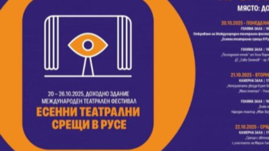 Днес е официалното откриване на Международния фестивал "Есенни театрални срещи в Русе". Програмата включва представления от България, Унгария и Република Северна Македония, а организаторите очакват зрители от цяла България и Румъния, както се е случвало и през изминалите издания.