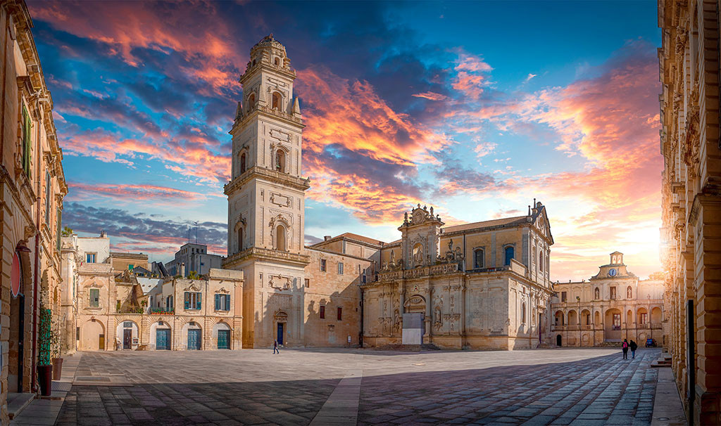 От нея започват главните улици, където на всяка крачка ви "дебнат" изящни гледки. На Виа Умберто I се намират дворецът Адорно и базиликата Санта Кроче – символът на Лече и шедьовър на барока. След това непременно трябва да посетите площад Сант'Оронцо - центърът на градския живот още от римско време с руините на древния амфитеатър. И, разбира се, Катедралният площад, където се намират великолепната църква и епископският дворец от 15 век.