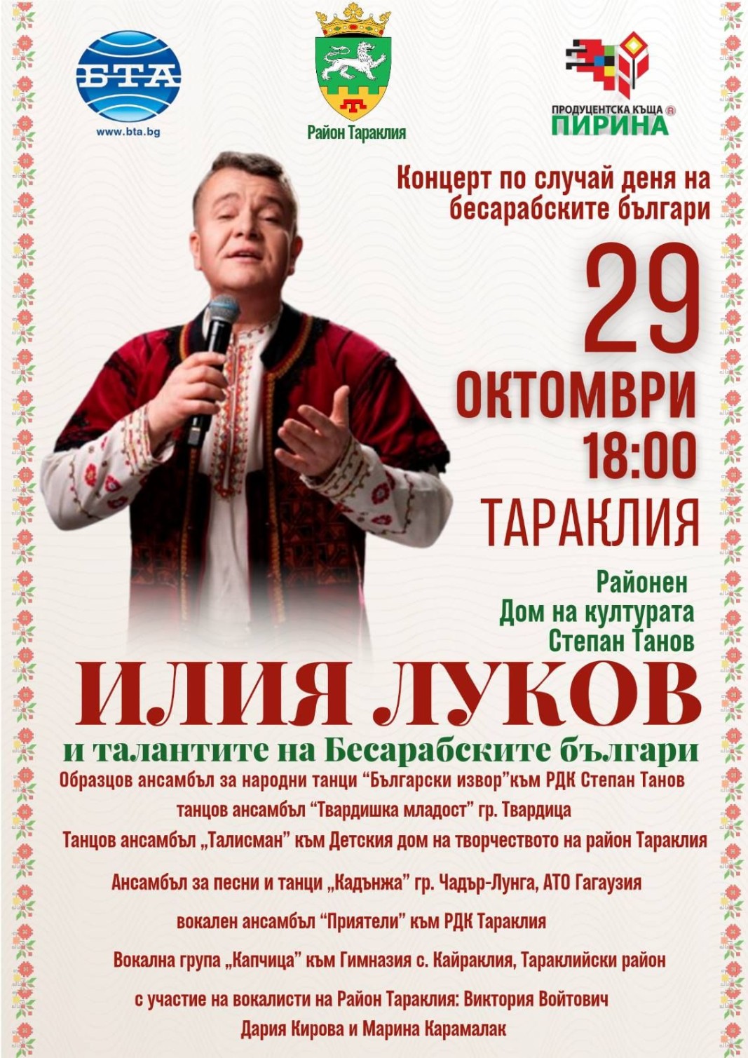 Българският народен изпълнител Илия Луков ще изнесе концерт в Тараклия по случай Деня на бесарабските българи. Концертът е част от поредица събития, които се организират благодарение на партньорството между Българската телеграфна агенция и Илия Луков, сключено в началото на тази година. В рамките на това сътрудничество певецът ще участва в концерти, посветени на празника на бесарабските българи, в Молдова и Украйна, и в други населени места с български общности.
