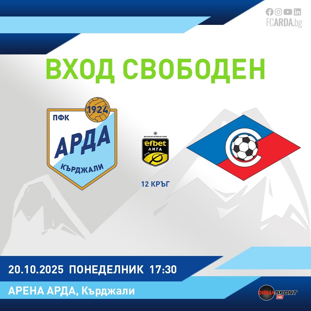 ръководството на ПФК АРДА обяви вход СВОБОДЕН, за мача със Септември, който ще се играе в понеделник 20 октомври от 17:30ч. на АРЕНА АРДА.