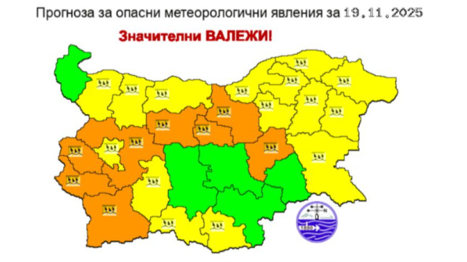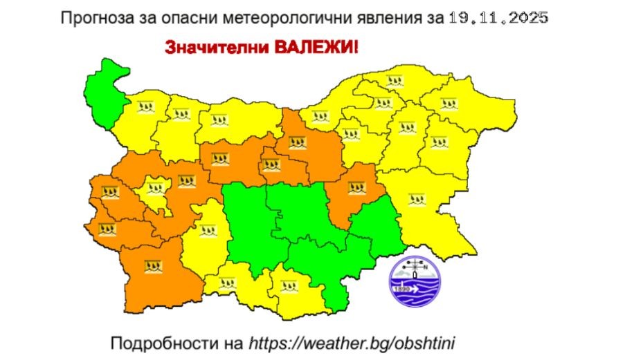 Времето в страната ще се задържи облачно с валежи от дъжд, значителни по количество на места в Югозападна, Централна Северна и Североизточна България, както и в южните райони на Източните Родопи. На по-малко места и по-малко по количество ще са валежите в югоизточните, а през деня и в северозападните райони. Националният институт по метеорология и хидрология (НИМХ) обяви оранжев и жълт код в няколко области у нас за интензивни валежи в сряда (19 ноември).