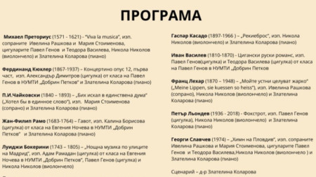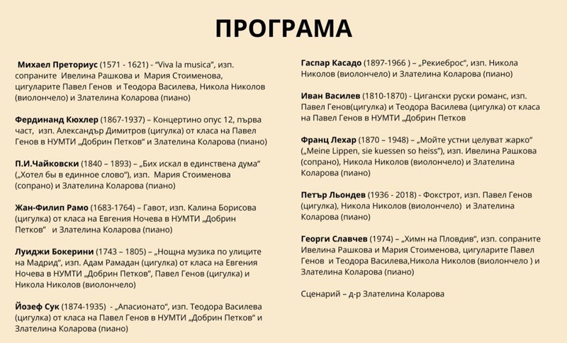 В концерта ще участват музикантите от Сдружението – Павел Генов (цигулка), Никола Николов (виолончело) и Злателина Коларова (пиано), както и прекрасните сопрани Ивелина Рашкова и Мария Стоименова.