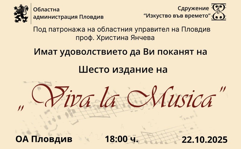 Сдружение „Изкуство във времето“ открива своя шести, творчески, сезон с традиционния концерт „Viva la Musica“, който ще се състои на 22 октомври (сряда), от 18. 00 часа, в Областна администрация – Пловдив. Събитието се провежда под патронажа на областния управител проф. Христина Янчева.