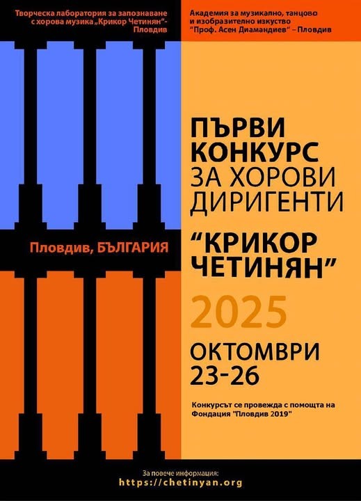 От днес в Академията за музикално танцово и изобразително изкуство "Проф. Асен Диамандиев" - Пловдив започва първият международен конкурс за хорови диригенти "Крикор Четинян". Той е организиран от висшето училище и Творческата лаборатория за хорова музика „Крикор Четинян“.
