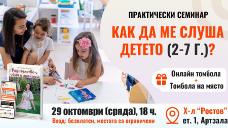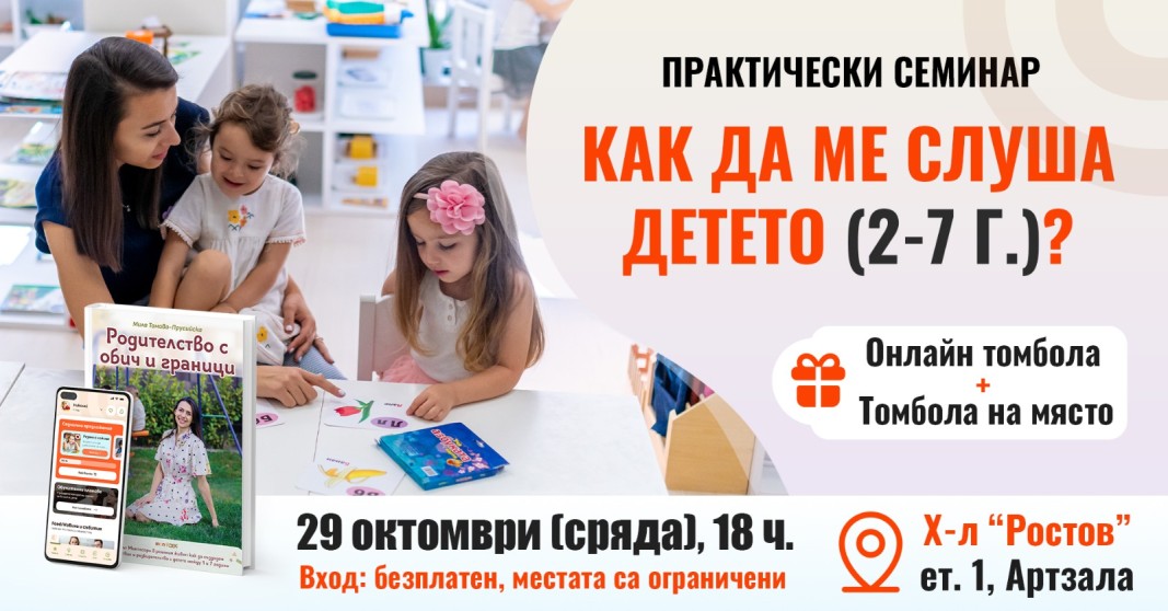В Плевен книгата ще бъде представена под формата на практически семинар за родители на тема: “Как да накарам детето да ме слуша (2-7 г.)”. Събитието е подходящо за родители, баби, дядовци, учители, помощник-възпитатели и всеки, който иска да има спокойствие и разбирателство във взаимоотношението си с децата. Утре /29.10./ от 18:00 в Хотел “Ростов”, ет. 1, Артзала. Входът е свободен.
