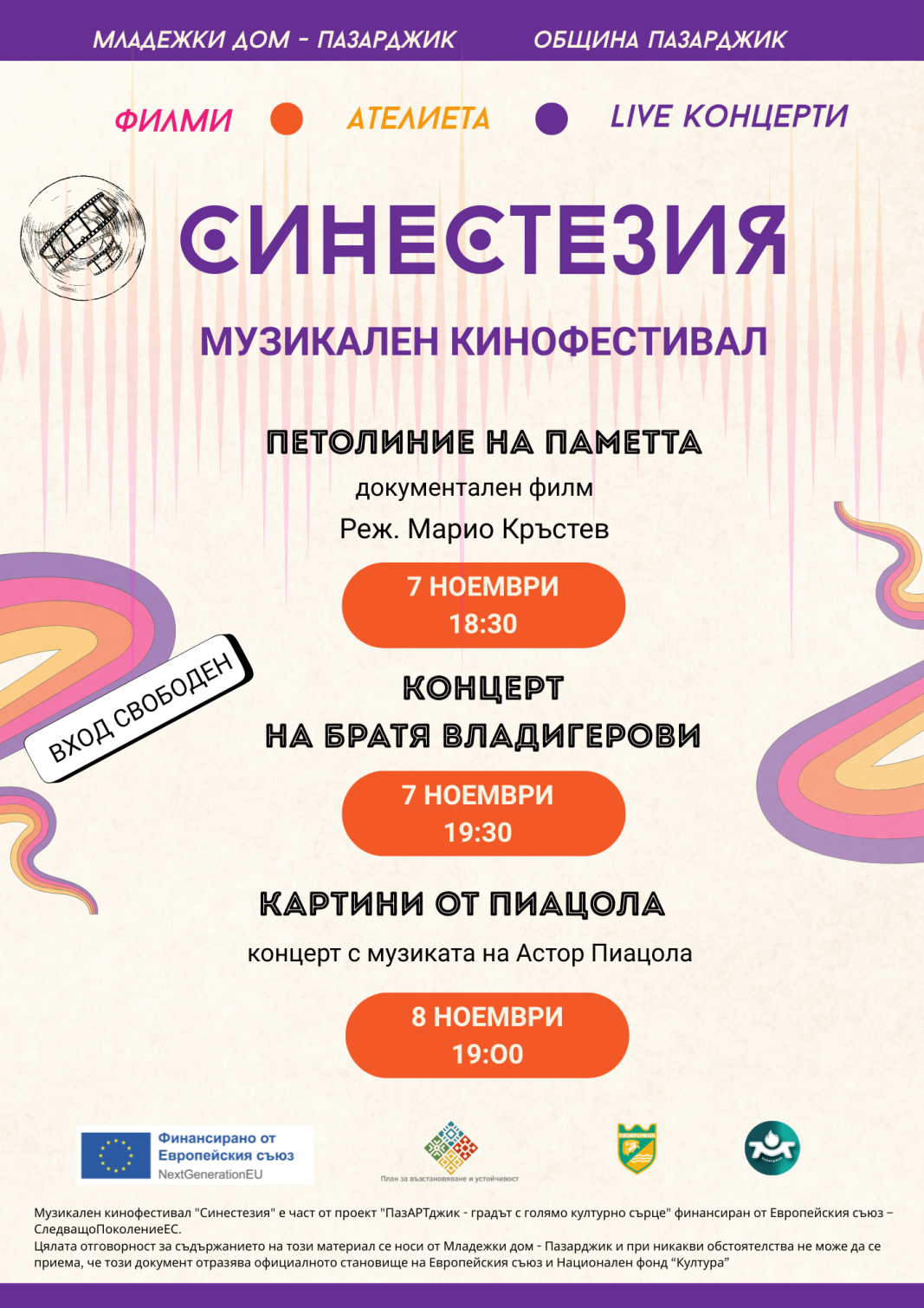 На 7 ноември е прожекцията на документални филм „Петолиние на паметта“ със режисьор Марио Кръстев. Документалният филм изследва паметта на музиката като културно наследство, съчетавайки лични истории, архивни кадри и нови интерпретации на класически произведения. След прожекцията зрителите ще се насладят и на концерт на братя Владигерови – виртуозно дуо, което обединява джаз, етно мотиви и класическо звучене в неповторимо музикално преживяване.
