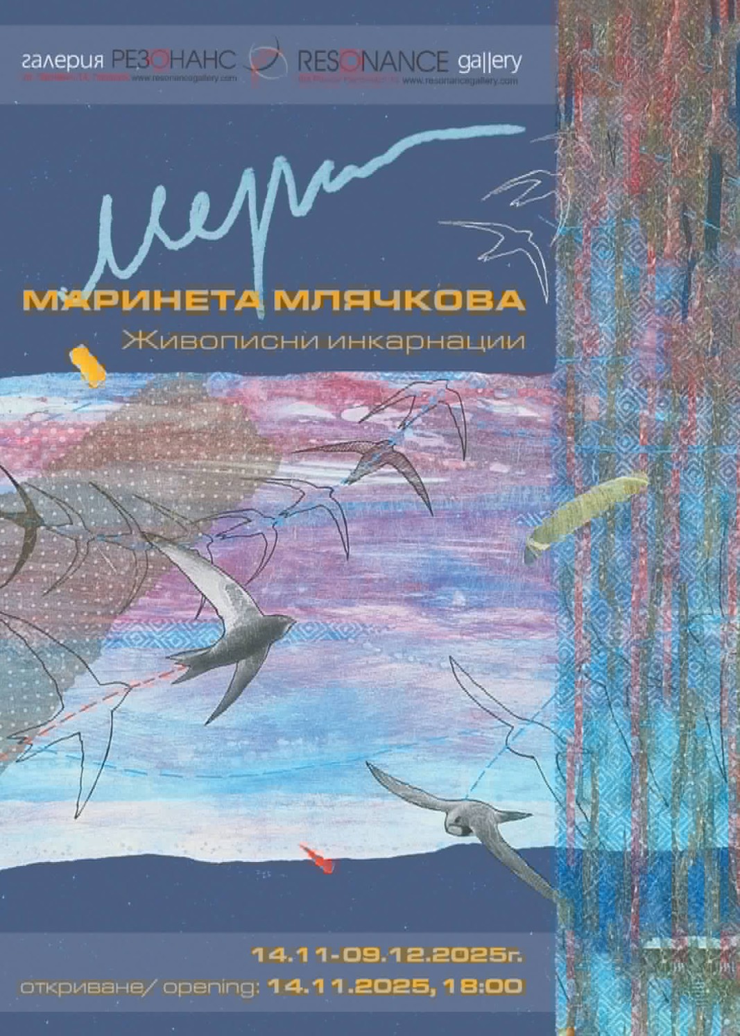В Галерия Резонанс са подредени картините от изложбата на Маринета Млячкова "Живописни инкарнации", които можете да разгледате до 9 декември.