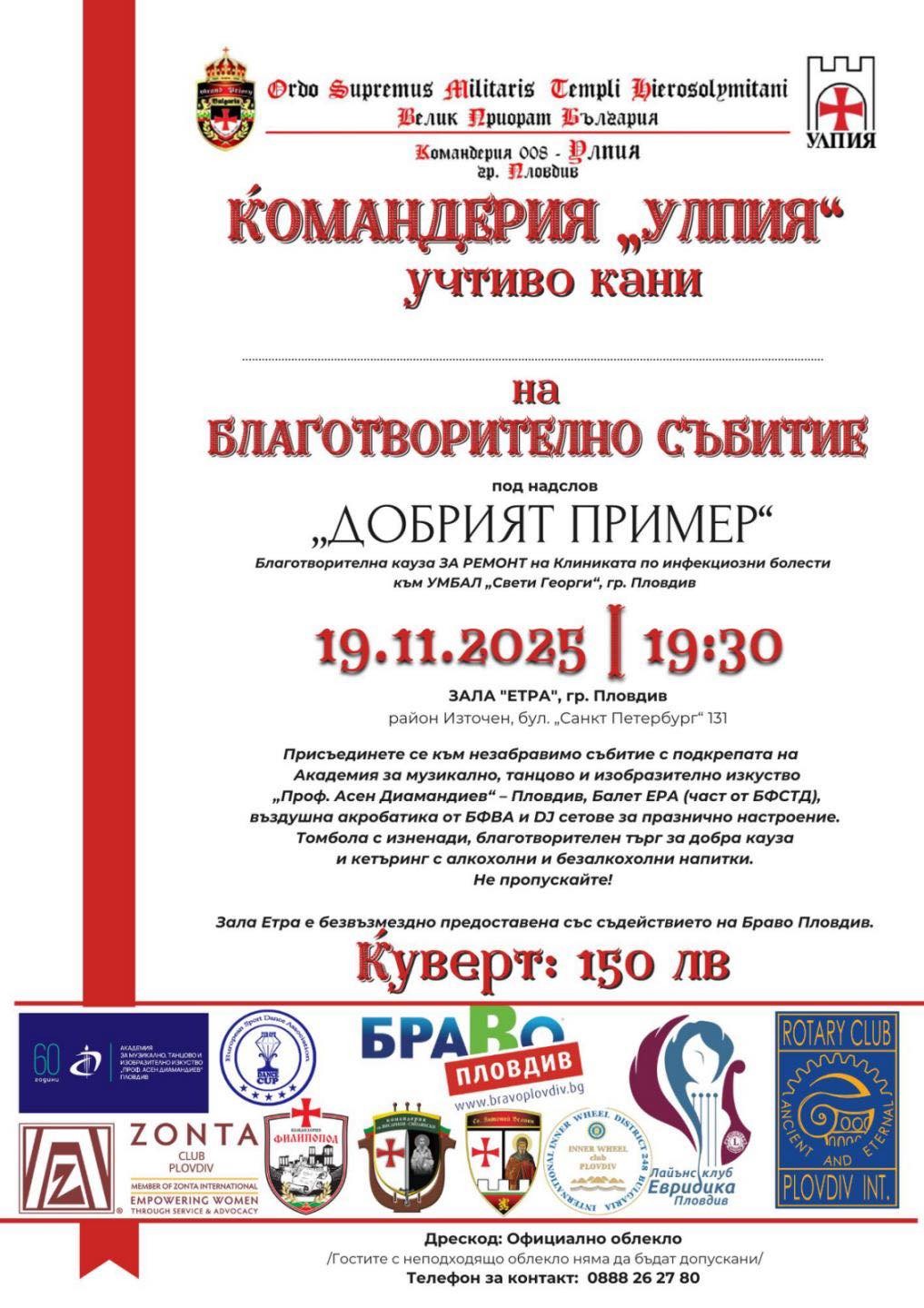 Богата музикална и танцова програма ще бъде представена по време на събитието "Добрият пример". Благотворителната инициатива за набиране на средства се организира от командерия "Улпия" за техния 19-ти рожден ден.