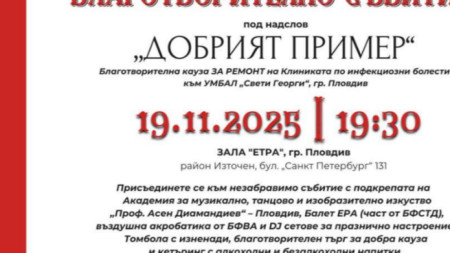 Предстои ни една фантастична вечер на 19 ноември, в която всичко е подчинено на благородна кауза, казва Красимир Джамбазов, организатор на инициативата. Целта е да се събират средства за ремонта на Клиниката по инфекциозни болести към УМБАЛ „Свети Георги“ - Пловдив.