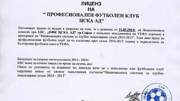 Предоставяме на Вашето внимание писмото на БФС за лиценза на ПФК ЦСКА АД за сезон 2014/2015.