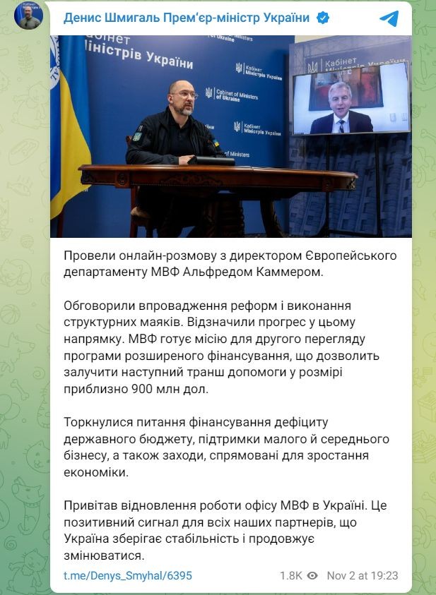 Украинският премиер Денис Шмигал заяви в четвъртък в публикация в Telegram, че Киев се надява да получи още 900 милиона долара от Международния валутен фонд (МВФ).