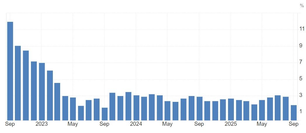Това е най-ниското ниво на потребителската инфлация от септември 2023 г. насам, обусловено от по-слаб растеж на цените в повечето категории, като например храни и безалкохолни напитки (до 1,4% от 2,2%), алкохолни напитки и тютюн (1% спрямо 1,2%), дрехи и обувки (5,2% спрямо 7,7%), жилища (0,2% спрямо 3,7%), жилищно оборудване (0,4% спрямо 0,6%), здравеопазване (0,1% спрямо 0,6%), отдих и култура (1% спрямо 1,2%) и хотели, кафенета и ресторанти (5,9% спрямо 6,2%).