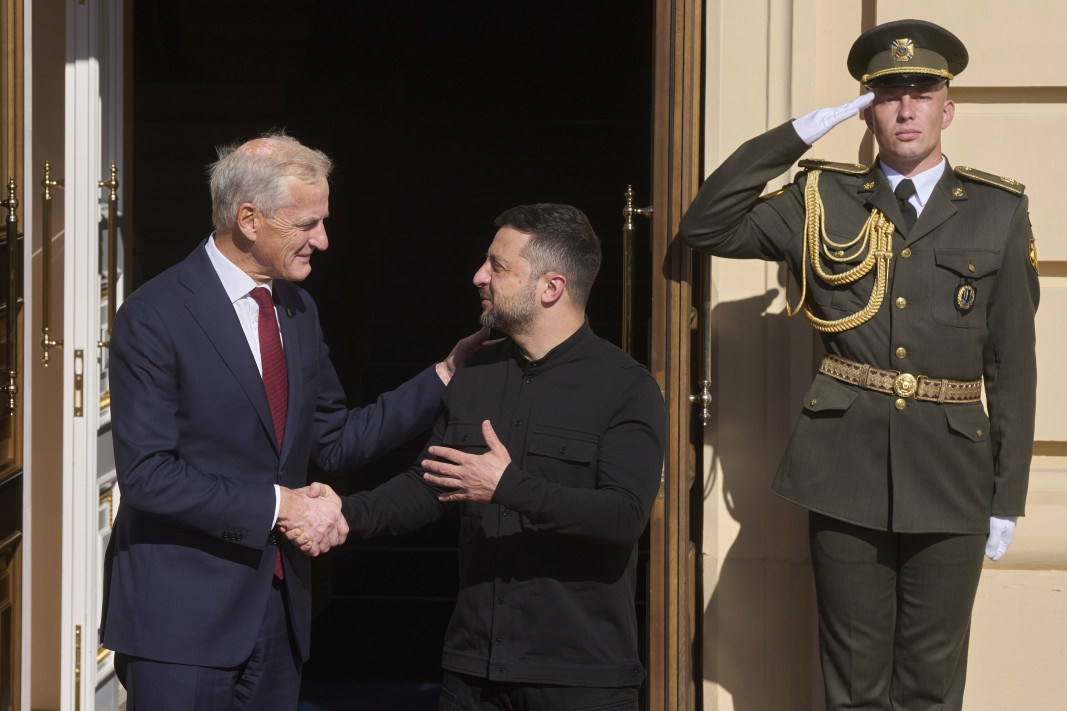 Украинският президент се здрависва с норвежкия премиер Йонас Гар Стьоре.