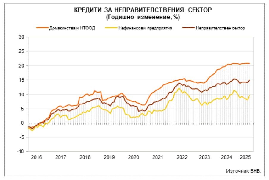 Кредитите за домакинства и НТООД през септември 2025 г. пък са в размер на 53,675 млрд. лева (24,4% от БВП), като спрямо същия месец на 2024 г. те се увеличават с 20,9% след повишение с 20,8% през август 2025 г.