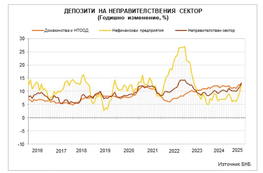 В същото време кредитите за неправителствения сектор през деветия месец на 2025 г. са в размер на 114,289 млрд. лева (52% от БВП), като нарастват на годишна база с 15% след повишение с 14,1% през август.