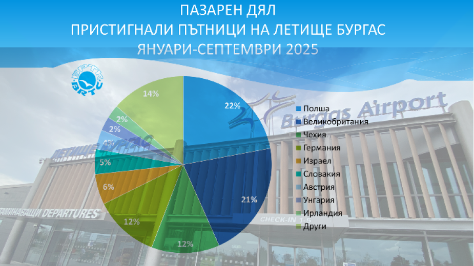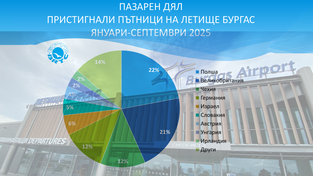 Летище Бургас отчита оживление на входящия туристически трафик през 2025 г., макар и с умерени темпове. За периода януари–септември 2025 г. през аерогарата са посрещнати общо 894 хил. пътници, което е с 3% повече спрямо същия период на 2024 г.. Въпреки ръста, въздушният поток все още изостава значително от нивата преди пандемията – с около 37% по-малко спрямо 2019 г., или приблизително 520 хил. пътници по-малко. Това показва, че възстановяването на чартърния туризъм в Бургаско изостава от темповете, отбелязани в някои конкурентни дестинации.