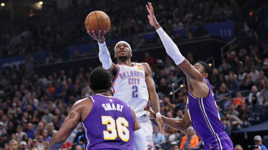 Гилджъс-Алекзандър от Оклахома (в бяло) наниза 30 т. за победата над Лейкърс със 121:92.