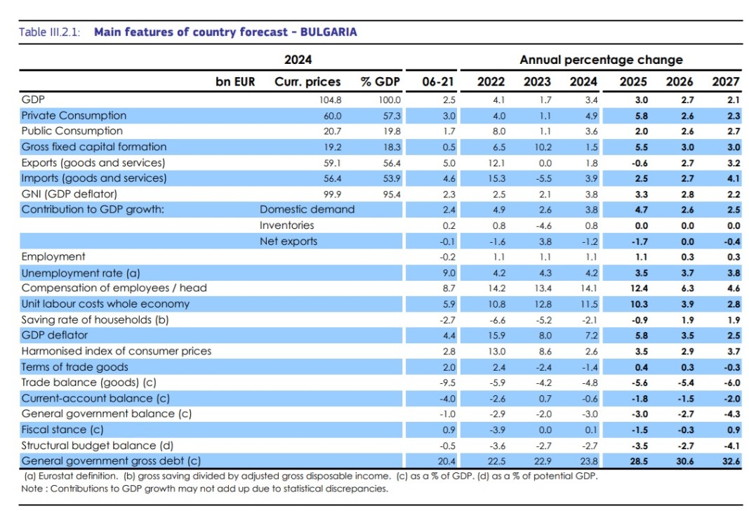 През 2024 г. икономиката е нараснала с 3,4% под влиянието на публичното и частното потребление, но този темп няма да се запази, отбелязва Комисията.