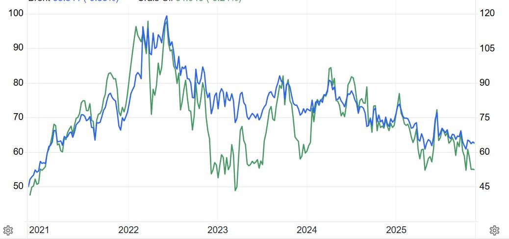 Фючърсите на суровия петрол Брент достигнаха на 12 ноември $62,70 за барел, след което бяха 62,71 долара на 12 ноември, след което отскочиха към $64 долара за барел през последните дни на търговия, докато цената на руския петрол "Уралс" от петролния хъб Новоросийск поскъпнаха леко в понеделник към $47 за барел.