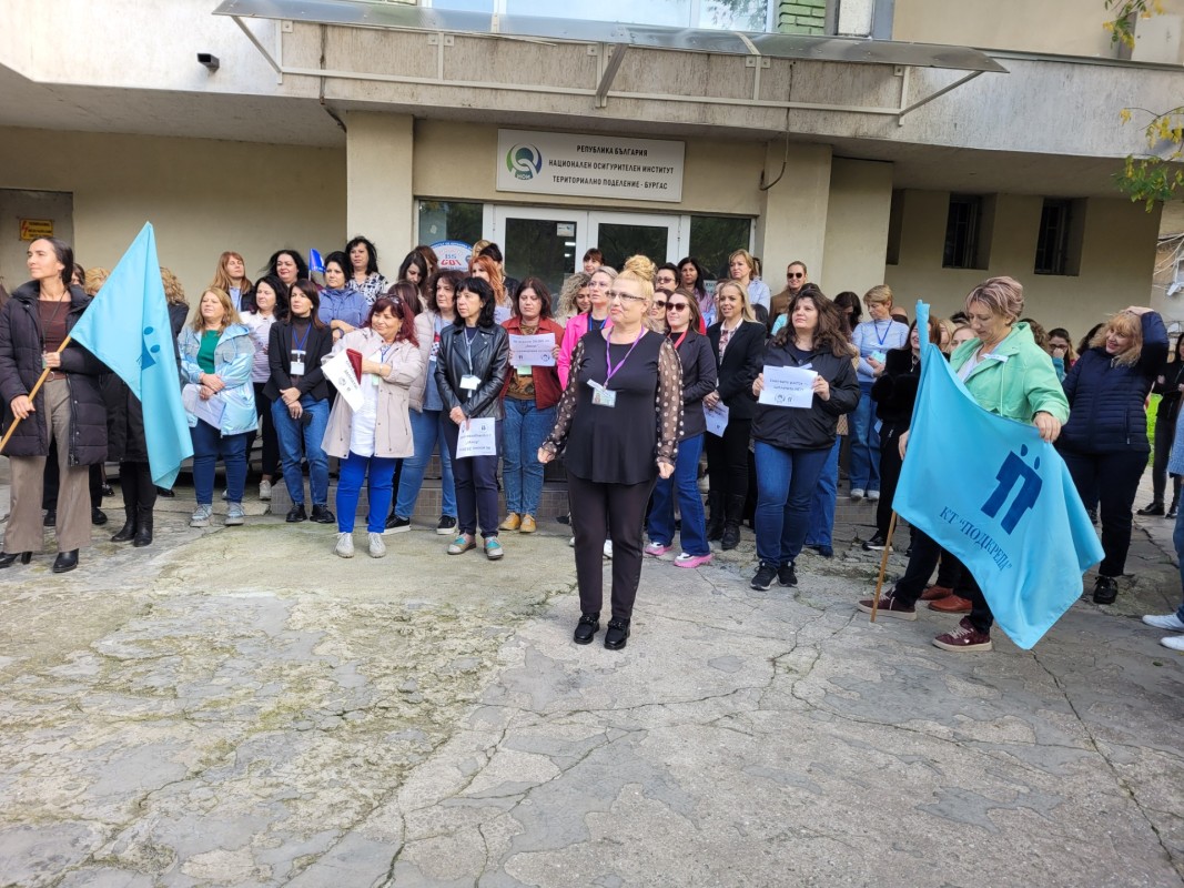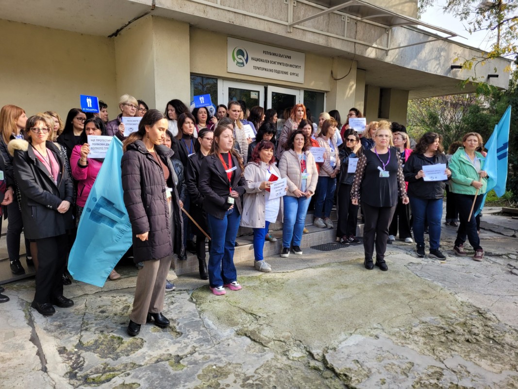 Близо 50 служители на НОИ в Бургас протестираха, за по-високи заплати, пред сградата на институцията. Те настояват освен за 20% увеличение на трудовите им възнаграждения и за отпадане на статута „държавен служител“.