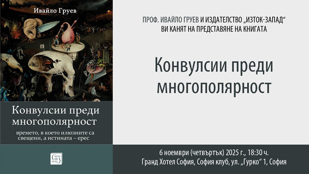 "Конвульсии перед многополярностью - время, когда иллюзии священны, а истина - ересь" - так называется новая книга, которая официально будет представлена на днях в Софии. Она рассказывает об агонии однополярного мира, времени геополитических трансформаций и пробудившихся монстров. Автором этого политико-философского анализа мирового порядка является профессор Ивайло Груев, преподаватель политологии Оттавского университета, с научными публикациями в Канаде, США, Англии, Германии и России. Болгарский ученый - автор книг и учебников по политическим наукам, в 2012 г. был номинирован на звание лучшего профессора Оттавы, а в 2017 г. был награжден орденом "150 лет Канады".