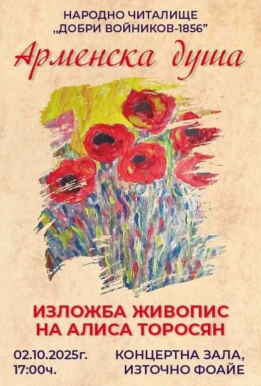 Изложба живопис "Арменска душа" на Алиса Торосян ще бъде представена днес - 2 октомври, от 17.00 часа в източното фоайе на концертната зала на читалище „Добри Войников“ в Шумен.