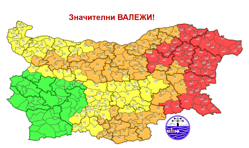 Червен предупредителен код за значителни валежи издаде за утре, 7 октомври, Националният институт по метеорология и хидрология за 8 области в Източна и Североизточна България.
