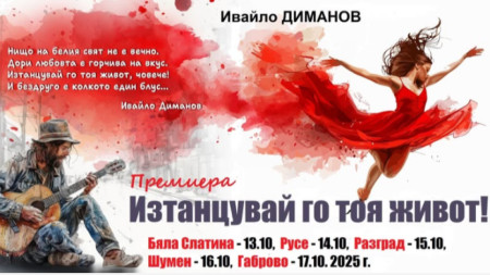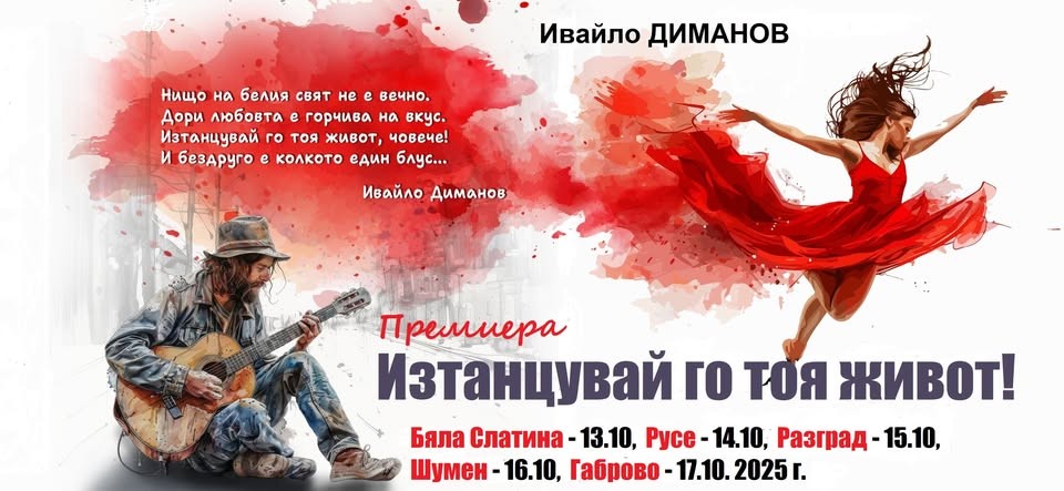 Концертно-литературното турне „Изтанцувай го тоя живот“ е тази вечер от 18:00 часа в шуменското Народно читалище „Добри Войников“.