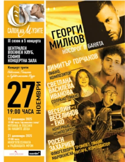 "Започваме с "Носорог в банята" от сборника разкази "Ръчен багаж" на журналиста Георги Милков, другата муза е небесната с Росен Захариев, Еко, и Димитър Горчаков, в памет към Румен Тосков - Рупето. Аз пея "хомеопатичен" барок от 17 век, но началото е сюитата на Роко, който ще свири на пиано - има много инструменти в душата и сърцето му.