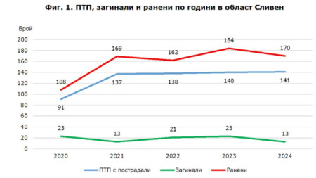 Намалява броят на загиналите и ранените при катастрофи в област Сливен, сочат данните на Териториално статистическо бюро Югоизток към НСИ за пътната безопасност в региона. През 2024 г. на територията на област Сливен са регистрирани 141 тежки..
