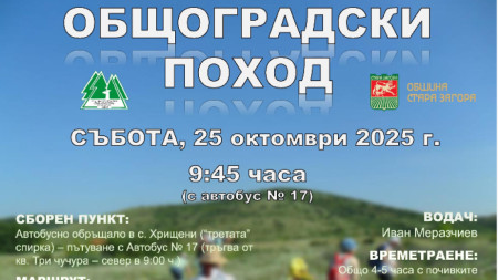 Продължава традицията в края на всеки месец да бъде организиран Общоградски поход край Стара Загора. Инициативата е поета от Туристическо дружество „Сърнена гора" , с подкрепата на Община Стара Загора. Походът този месец ще се състои на 25..
