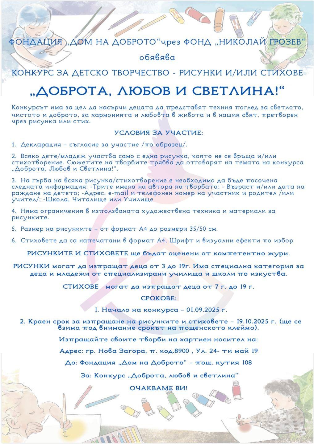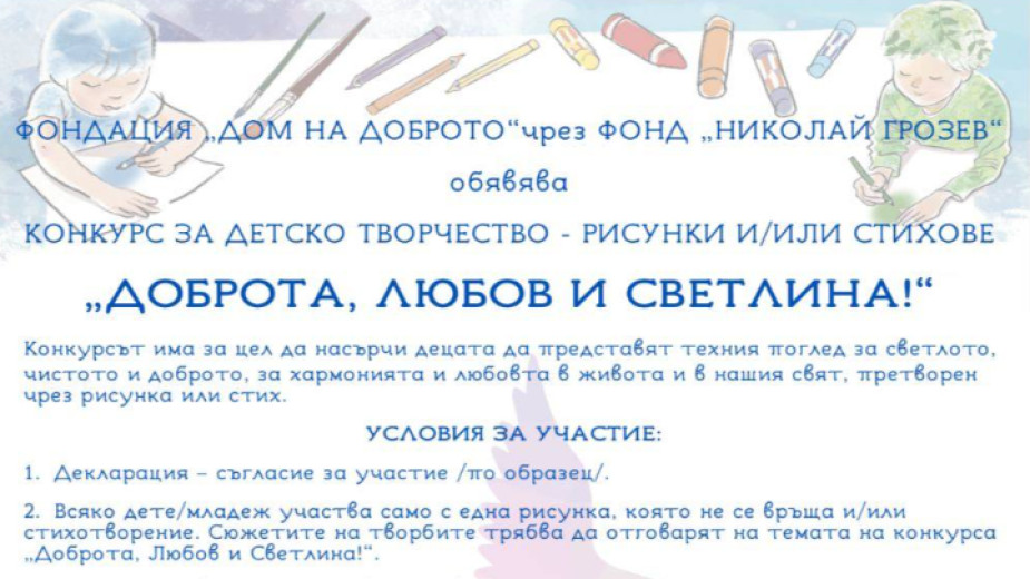 Над 300 рисунки и 46 стихотворения са изпратили деца от 3 до 19 години от цялата страна за участие в Националния конкурс за рисунка и поезия на тема „Доброта, любов и светлина“. Той се организира за втора поредна година от Фондация „Дом на доброто“ и Фонд „Николай Грозев“. В тазгодишната надпревара участниците са три пъти повече от миналогодишната. "Децата търсят доброто в любовта между детето и майката, в грижата към животните и природата, към деца в беда или в тежка житейска ситуация, а претворяват любовта в светлина и в дъга. Темата за доброто, любовта и красотата вълнува малките таланти и смело творят на тази тема", каза за Радио Стара Загора Светла Стоянова от Управителния съвет на Фонд "Николай Грозев".